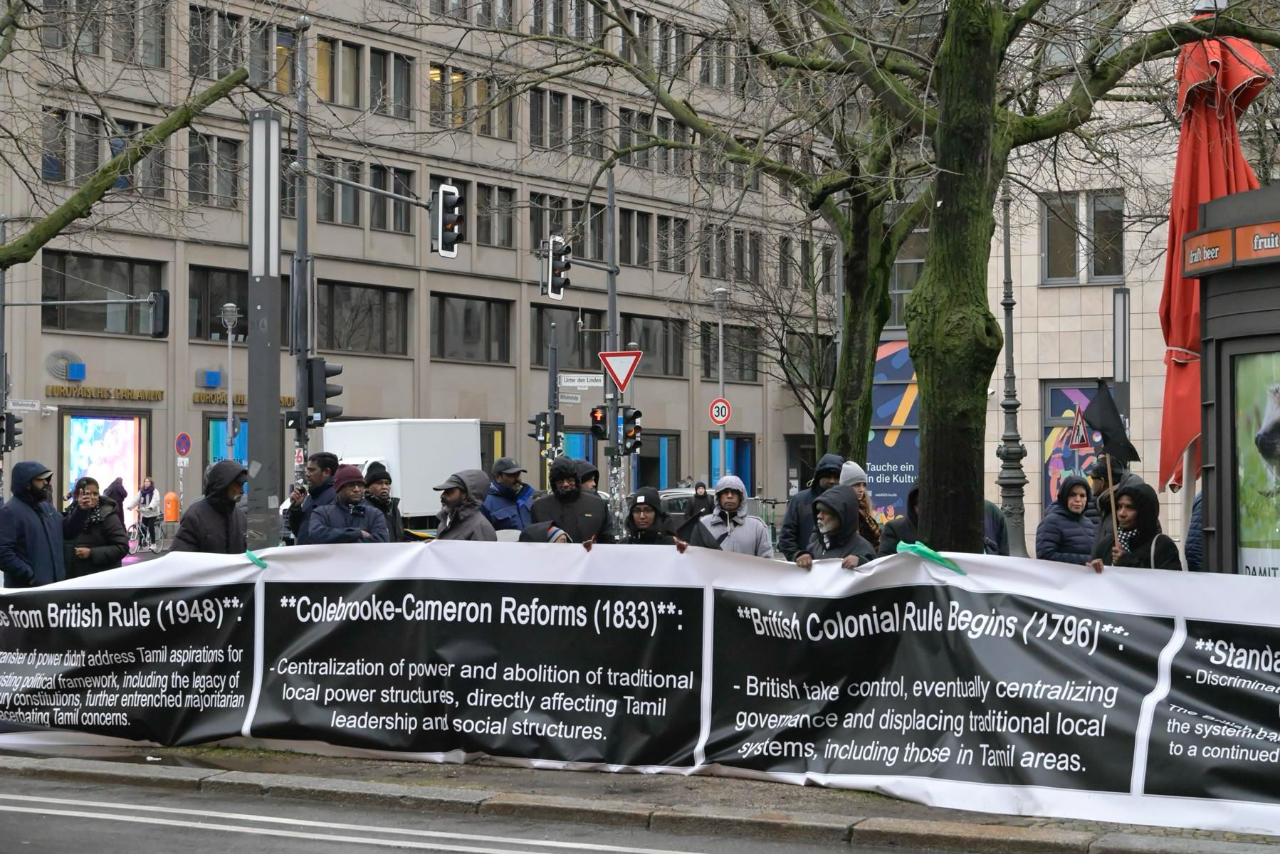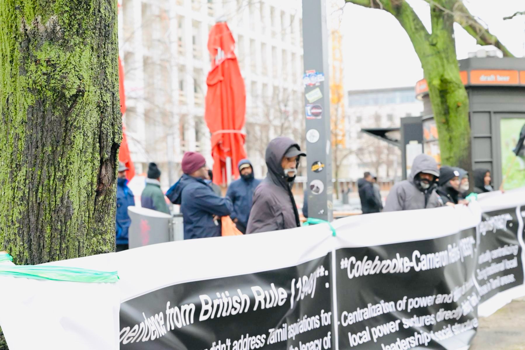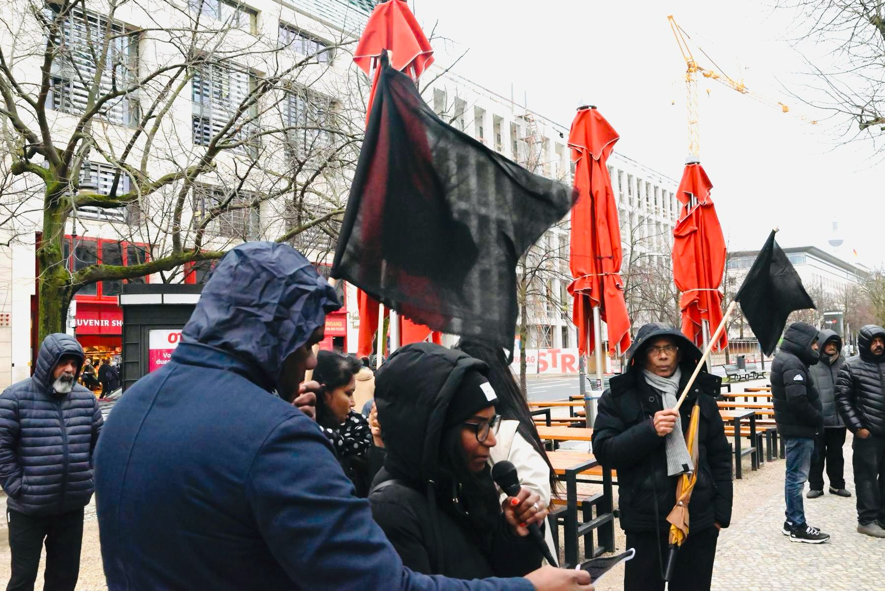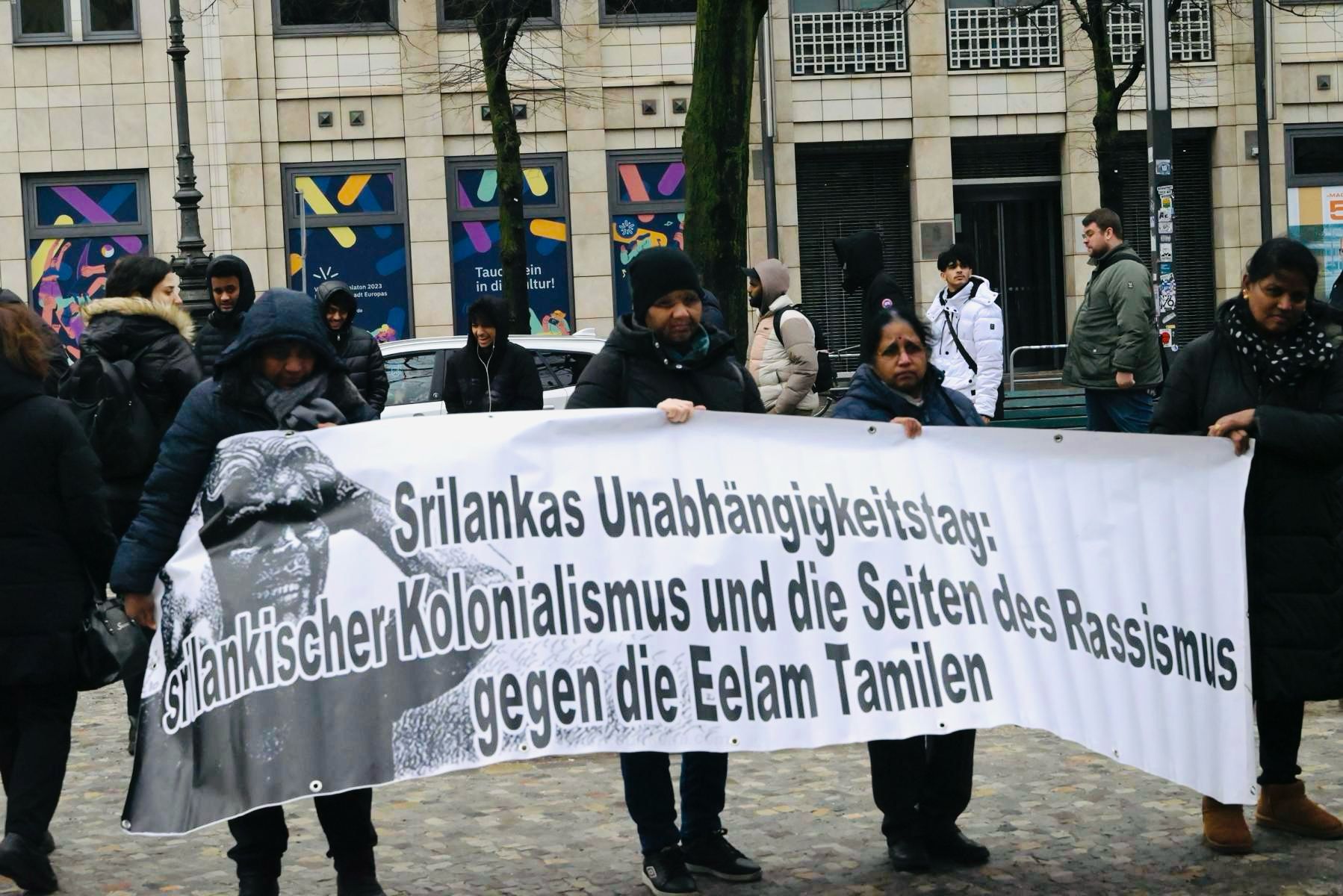 சிங்கள பேரினவாத அரசின் 76 வது சுதந்திர தினத்தை புறக்கணிக்கும் முகமாக யேர்மன் தலைநகரில் பிரித்தானியா தூதரகத்தின் முன்னால் கடும் குளிர் மற்றும் சீரற்ற காலநிலைக்கு மத்தியிலும் தமிழின உணர்வாளர்கள் ஒன்றுகூடி அடையாள கவனயீர்ப்பு நிகழ்வில் ஈடுபட்டனர்.