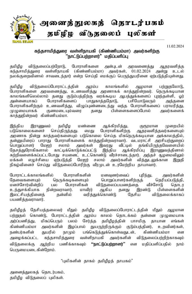 சிறப்பு செய்திகள் கிண்ணியம்மா நாட்டுப்பற்றாளராகா மதிப்பளிக்கப்பட்டார். By Admin - February 11, 2024 0 200