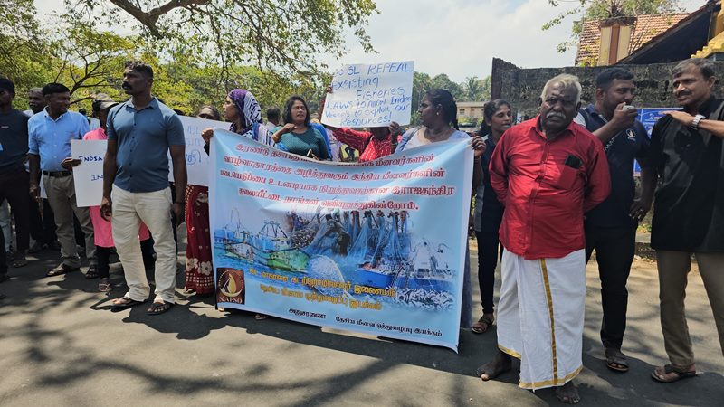 இந்தநிலையில், பொலிஸாரால் இடைமறிக்கப்பட்ட போராட்டக்காரர்கள், “இலங்கை மீனவர்களின் கடல் வளத்தை அழிக்காதே”, “தமிழக மீனவர்களின் அத்துமீறலைத் தடுத்து நிறுத்து”, “எமது கடல் வளப் பாதுகாப்பை உறுதி செய்” உள்ளிட்ட பல்வேறு வாசகங்கள் எழுதப்பட்ட பதாகைகளைத் தாங்கியவாறு இலங்கை – இந்திய அரசுகளுக்கு எதிராக கோஷங்களை எழுப்பினர்.