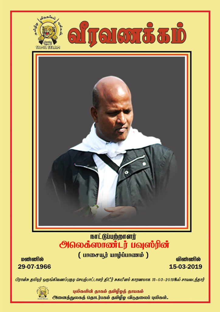 பிரான்சில் 15.03.2019 அன்று திடீர் சுகயீனம் காரணமாக சாவடைந்த நாட்டுப்பற்றாளர் அலெக்ஸாண்டர் பவுஸ்ரின் அவர்களின் 5ஆம் ஆண்டு நினைவேந்தல் நாள் இன்று 15.03.2024 வெள்ளிக்கிழமை ஆகும்.