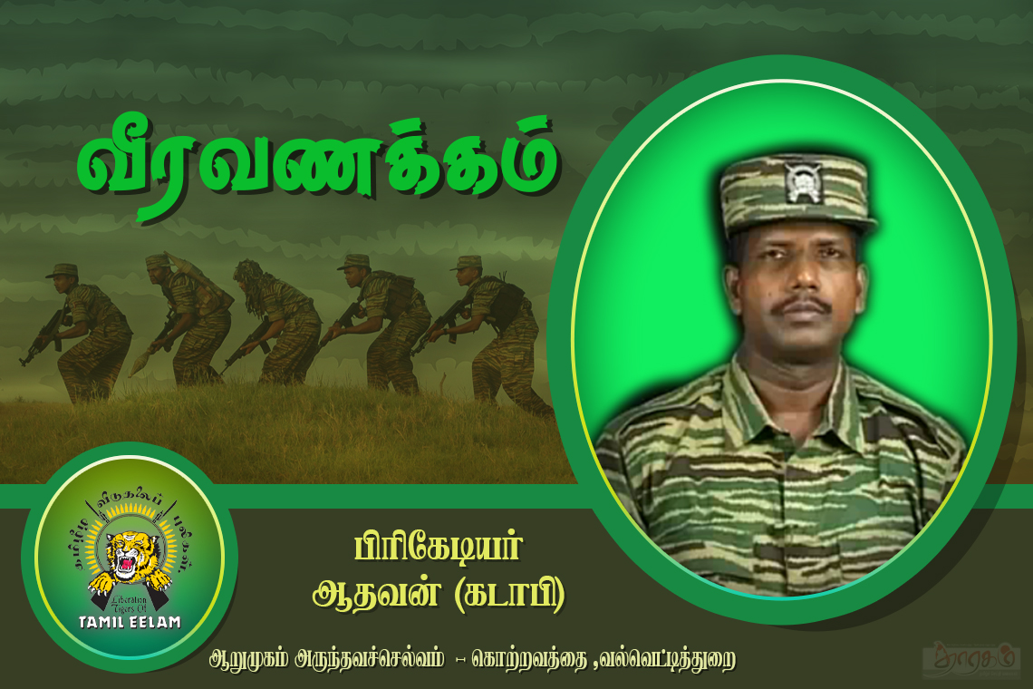 அனைத்துத் தளபதிகளுக்கும் போட்டிக்கான விதிமுறைகள் கூறப்படுகிறது. குறிப்பிட்ட நேரத்துக்குள் 10 ரவைகளையும் குறுப்பீங்காய்(துல்லியமான சூட்டு இடைவெளி) அடிப்பவர்களுக்கே முதலிடம். ஒவ்வொருவரும் தங்களுக்கான ரவைகளை அடித்து முடித்தபோது இறுதி சூட்டாளரான கடாபி அண்ணை துப்பாக்கியைத் தூக்கி இலக்கைக் குறிபார்க்கிறார். அனைத்துத் தளபதிகளும் அவரையே கண்ணை இமைக்காமல் பார்க்கின்றனர். கண் இமைக்கும் நேரத்துக்குள் 10 ரவைகளையும் அடித்து விட்டு, கடாபி அண்ணை நிமிரும் போது, கடாபி அண்ணையும் “ஸ்கோரை” (பெறுபேரு) பார்ப்பதற்காக அனைவரும் தலைதெறிக்க ஓடுகின்றனர். “ஒரு ரவுண்ட்ஸ் மட்டும் தான் பிடிச்சிருக்கு” என்று முதல் பார்த்த கமல் சொல்ல, அதைத் தொடர்ந்து எல்லோரும் அதையே சொல்ல, தலைவர் அவர்கள் இலக்கின் பின்பக்கம் செல்கின்றார்.என்ன அதிசயம் அனைவரும் பிரமித்துப்போனார்கள். ஒரு ரவை போன அதே பாதையால் பத்து ரவைகளும் போயிருக்கின்றன. கடாபி அண்ணையை அருகழைத்த தலைவர் அவர்கள் ஆரத்தழுவிக்கொண்டார். ஒரு தாய் சாதனை படைத்த தன் பிள்ளையை அணைத்த்துக் கொள்வது போல. அனைவராலும் பிரமிப்போடும் பெருமையோடும் நோக்கப்படும் ஆதவன் என்றளைக்கப்படும் கடாபி அண்ணையின் சாதனைகள் ஒன்றல்ல இரண்டல்ல ஓராயிரம் சாதனைகள். சாதாரண மனிதர்கள் நினைத்துக்கூட பார்க்கமுடியாத அளப்பெரும் தியாகங்களையும் சாதனைகளையும் புரிந்துவிட்டு விழி மூடித் துயில் கொள்ளும் இந்த மாவீரனின் வரலாற்றின் சிறு பகுதியை இங்கு தருகின்றேன்.