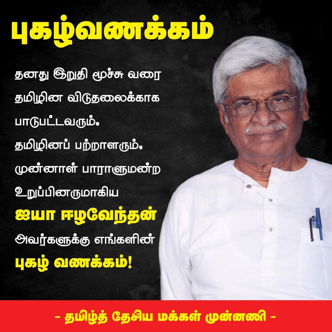 தமிழ்த் தேசத்து மக்களையும் விடுதலைப் போராட்டத்தையும் ஆழமாக நேசித்து இறுதி மூச்சுவரை இலட்சிய உறுதியோடு வாழ்ந்து எம்மைவிட்டுப் பிரிந்த தேசப்பற்றாளர் ம.க.ஈழவேந்தன் ஐயாவின் மறைவையொட்டி இரங்கல்கூட்டம் தமிழ்த் தேசிய மக்கள் முன்னணியின் ஏற்பாட்டில் இடம்பெற ஏற்பாடாகியுள்ளது.