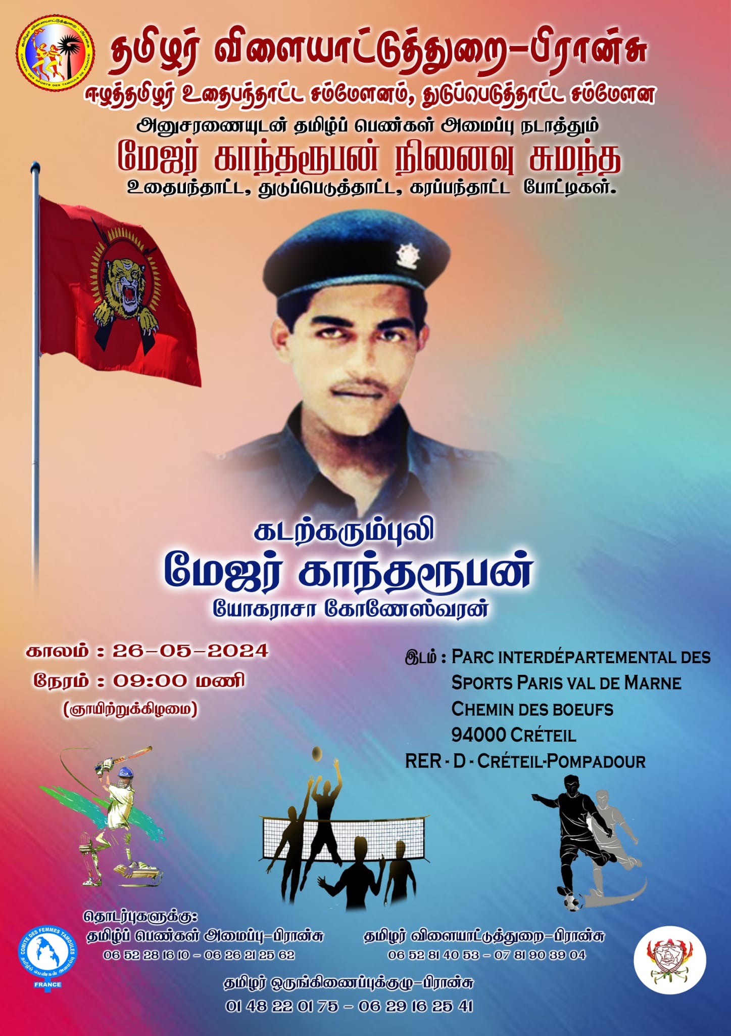 பிரான்சு தமிழர் ஒருங்கிணைப்புக்குழு தமிழர் விளையாட்டுத்துறை – ஈழத் தமிழர் உதைபந்தாட்ட சம்மேளனம், துடுப்பெடுத்தாட்ட சம்மேளனம் ஆகியவற்றின் அனுசரணையுடன் பிரான்சு தமிழ் பெண்கள் அமைப்பு நடாத்தும் மேஜர் காந்தரூபன் நினைவு சுமந்த உதைபந்தாட்ட, துடுப்பெடுத்தாட்ட, கரப்பந்தாட்ட போட்டிகள் இன்று 26.05.2024 ஞாயிற்றுக்கிழமை கிறித்தை பொம்பதூர் பகுதியில் காலை 9.00 மணிக்கு ஆரம்பமாகி இடம்பெறவுள்ளது.