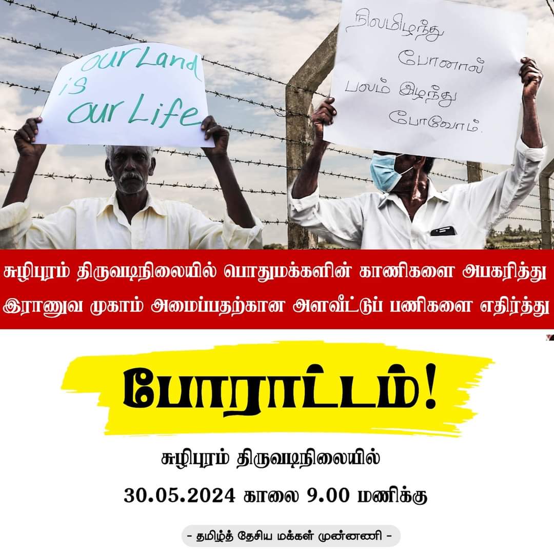 சுழிபுரம் திருவடி நிலையில் பொதுமக்களின் காணிகளை அபகரித்து இராணுவ முகாம் அமைப்பதற்காக நடைபெறும் அளவீட்டுப் பணிகளை எதிர்த்துப் போராட்டம் ஒன்றுநடை பெறவுள்ளது.