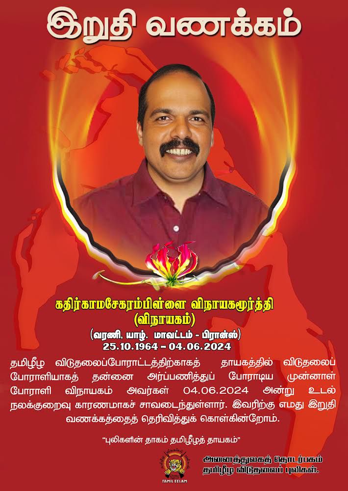 தமிழீழ விடுதலைப்புலிகளின் மூத்த உறுப்பினரும், முதுநிலைப் போராளியுமாகிய விநாயகம் (கதிர்காமசேகரம்பிள்ளை விநாயகமூர்த்தி ) அவர்கள் கடந்த (04.06.2024 ) செவ்வாய்க்கிழமை அன்று உடல் நலக்குறைவு காரணமாக பிரான்சு தேசத்தில் சாவடைந்தார்.