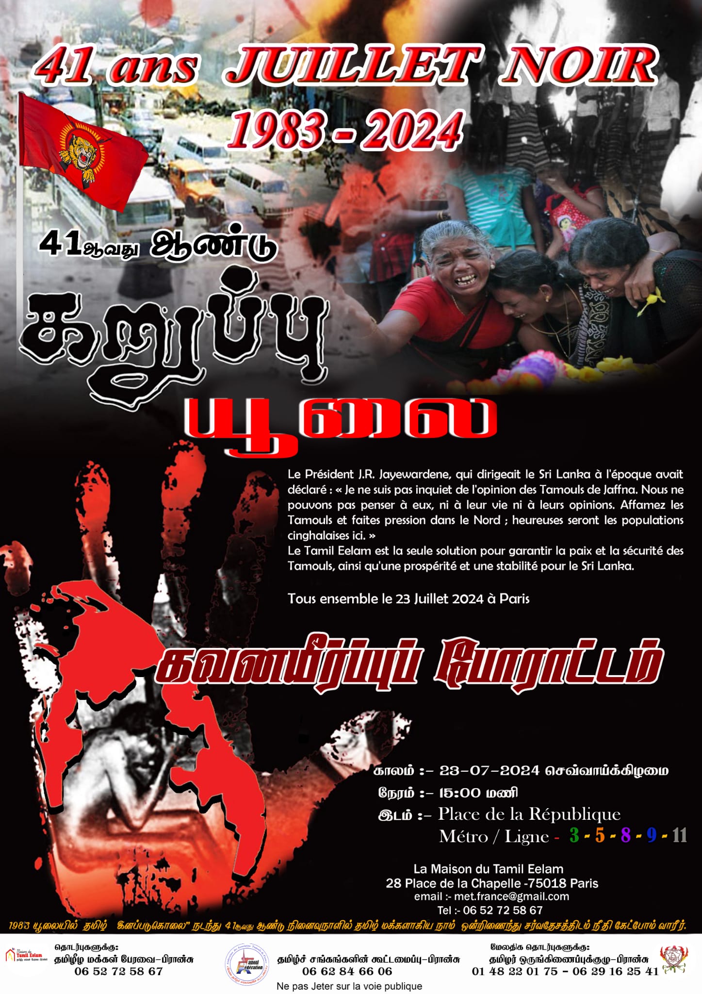 சிறப்பு செய்திகள்புலத்துச்செய்திகள் பிரான்சில் கறுப்பு யூலை 1983 தமிழினப் படுகொலை 41 ஆம் ஆண்டு நினைவேந்தல்! By Admin - July 11, 2024 0 214 பிரான்சில் கறுப்பு யூலை 1983 தமிழினப் படுகொலையின் 41 ஆம் ஆண்டு நினைவேந்தல் எதிர்வரும் 23.07.2024 செவ்வாய்க்கிழமை Place de la Republique பகுதியில் பிற்பகல் 15.00 மணிக்கு இடம்பெறவுள்ளது.