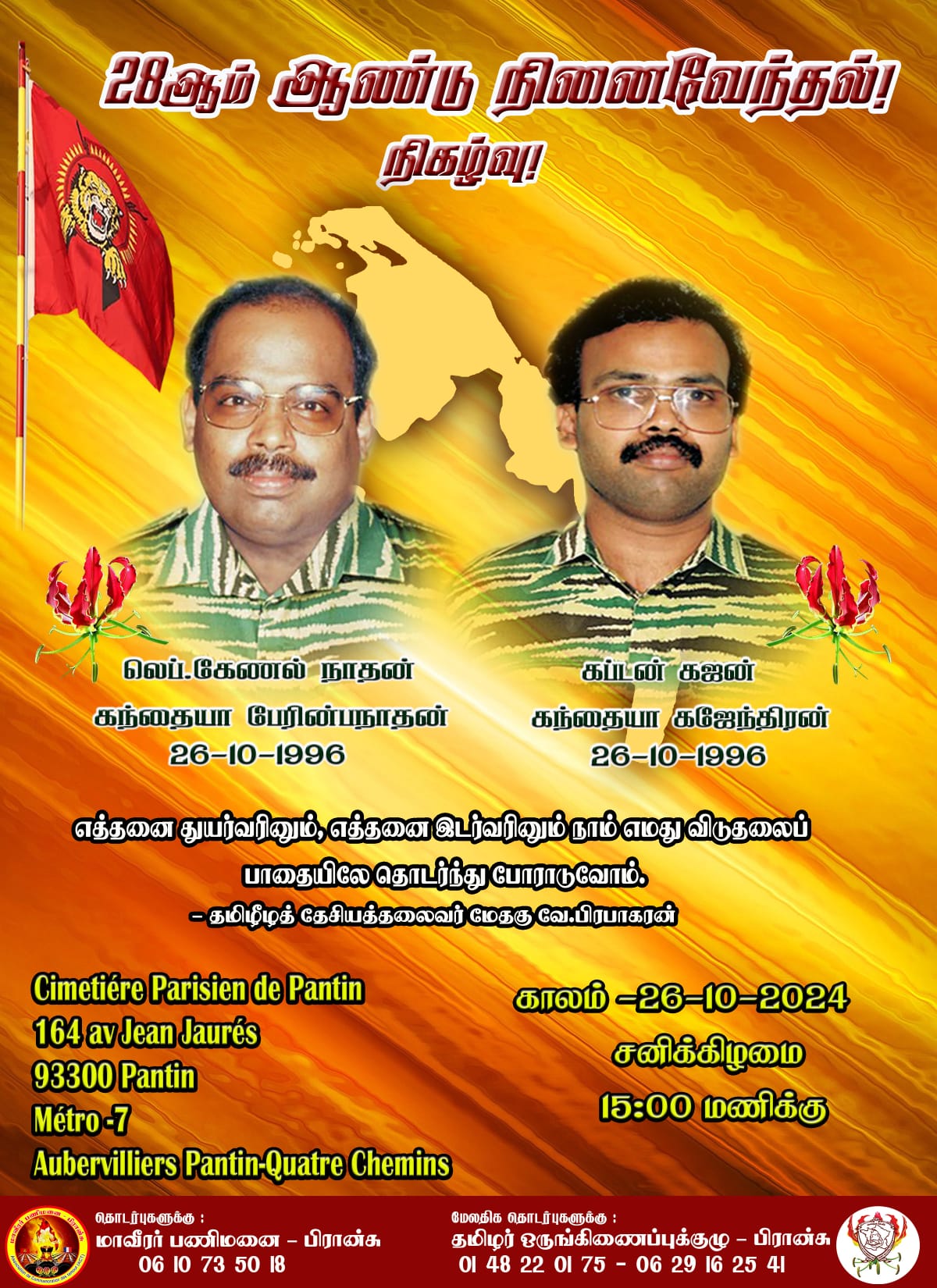 தமிழீழ விடுதலைப் புலிகளின் சர்வதேச நிதிப் பொறுப்பாளர் , ஈழமுரசு நிறுவன ஆசிரியர் கப்டன் கஜன் ஆகியோர் பகைவர்களால் கோழைத்தனமாக 26.10.1996 அன்று கொலைசெய்யப்பட்டு 28 ஆண்டுகள் ஆகின்றன.