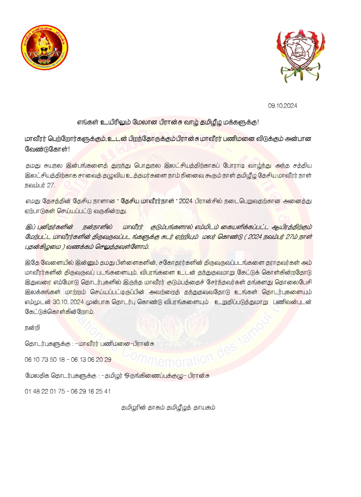 மேலதிக தொடர்புகளுக்கு:-தமிழர் ஒருங்கிணைப்புக்குழு-பிரான்சு