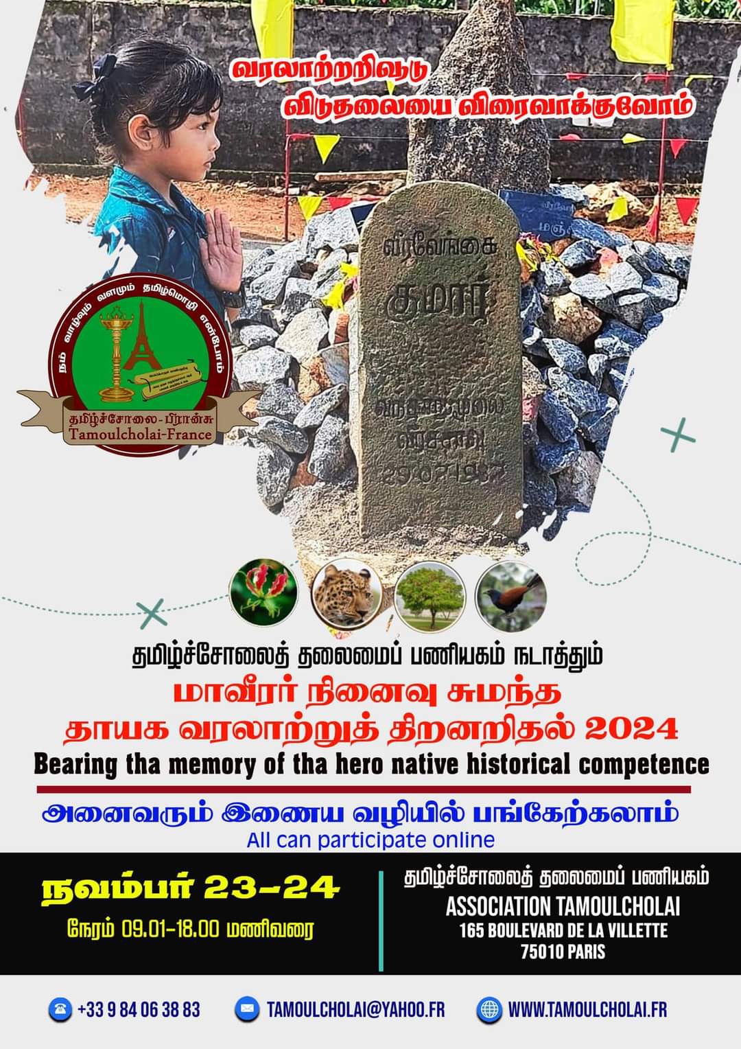 ஐந்தாவது ஆண்டாகத் தமிழ்ச்சோலைத் தலைமைப் பணியகத்தால் நடத்தப்படும் ‘தாயக வரலாற்றுத் திறனறிதல்’ எதிர்வரும் நவம்பர் 23-24 ஆகிய நாள்களில் இணைய வழியூடாக நடைபெறவுள்ளது.