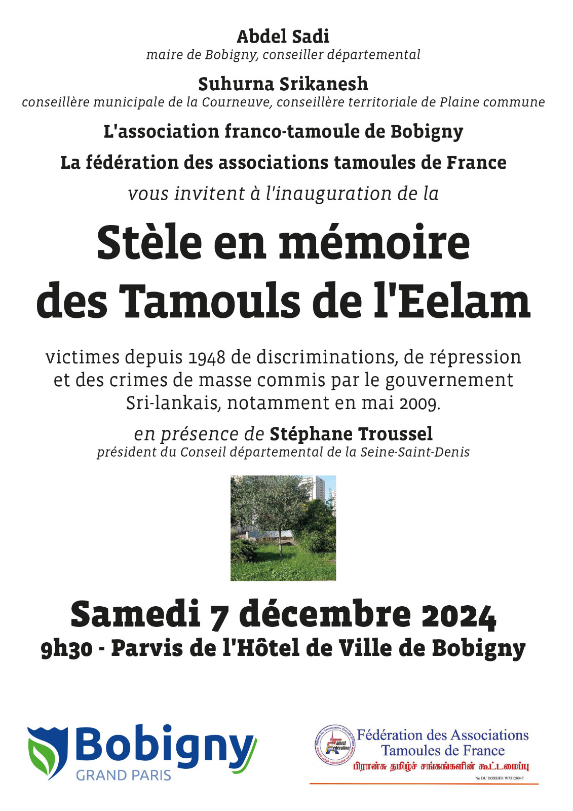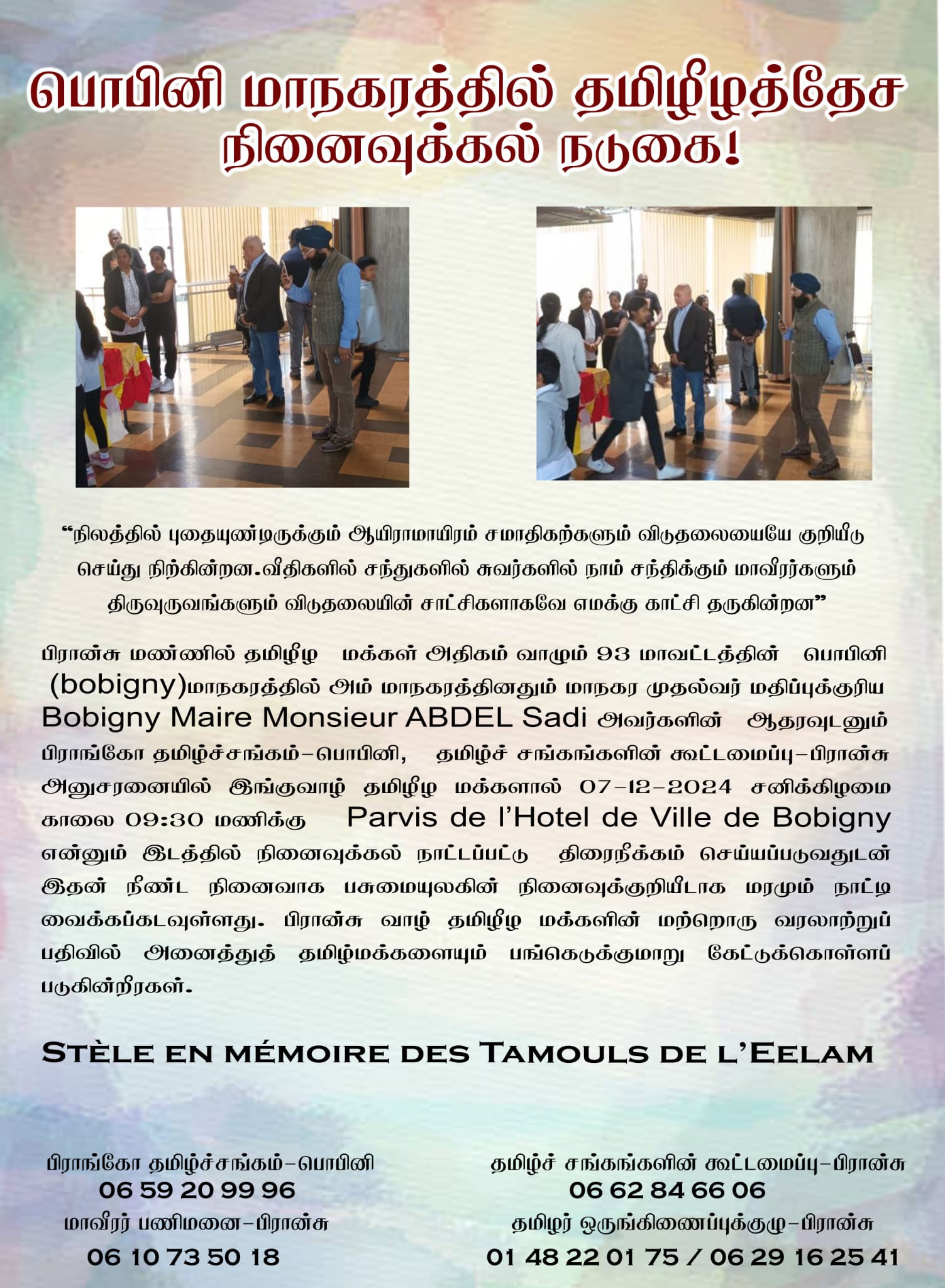 07.12.2024 சனிக்கிழமை காலை 9.00 மணிக்கு Parvis de I’Hotel de Ville de Bobgny என்னும் இடத்தில் நடைபெறவுள்ளது என்பதை அறியத்தருவதோடு, இதனை அனைவருக்கும் அறியத்தருமாறும் பணிவன்புடன் கேட்டுக் கொள்கின்றோம்.