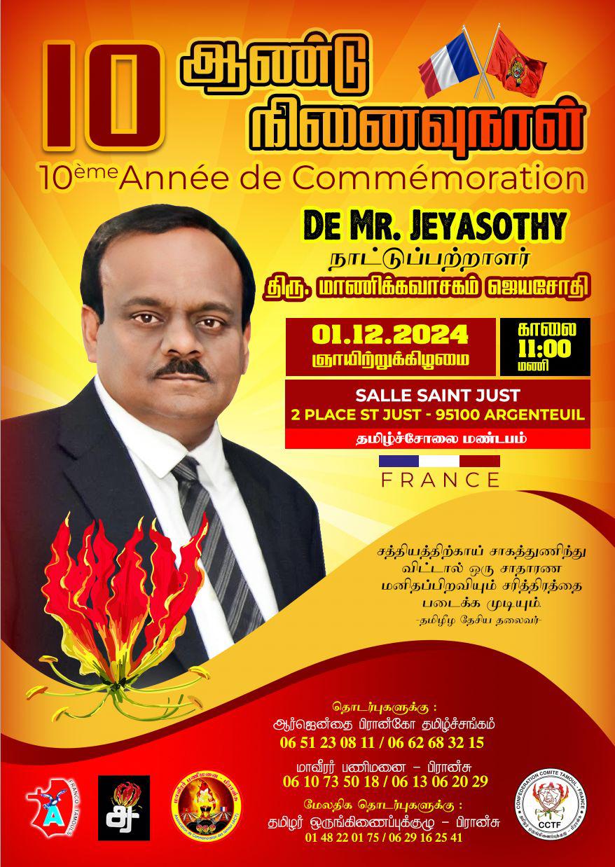கடந்த 24.11.2014 அன்று பிரான்சில் பாரிசின் புறநகர்ப் பகுதிகளில் ஒன்றான ஆர்ஜந்தேயில் சாவடைந்த நாட்டுப்பற்றாளர் மாணிக்கவாசகம் ஜெயசோதி அவர்களின் 10 ஆம் ஆண்டு நினைவு வணக்க நிகழ்வு ஆர்ஜந்தேயில் நாளை 01.12.2024 ஞாயிற்றுக்கிழமை முற்பகல் 11.00 மணிக்கு இடம்பெறவுள்ளது.