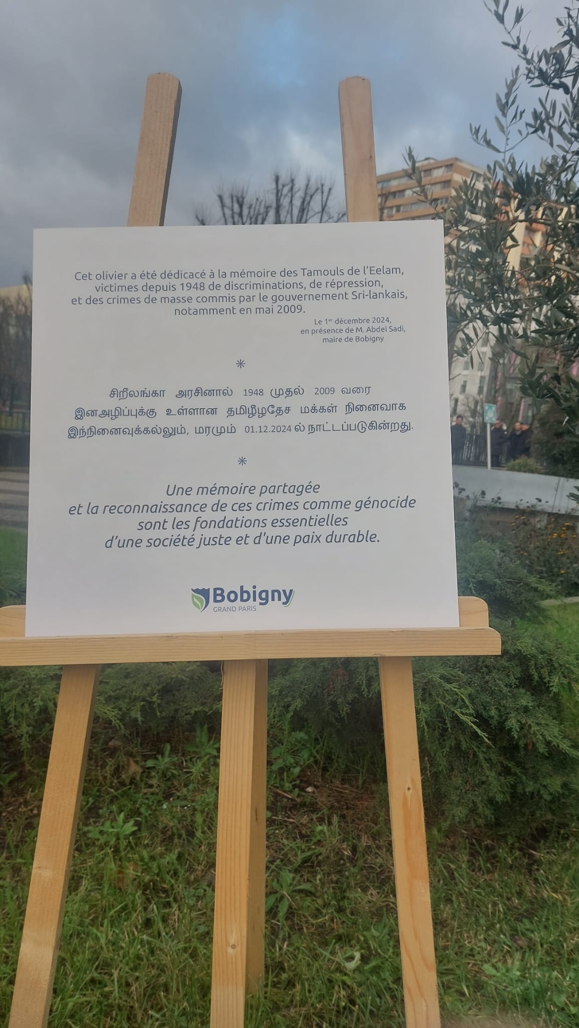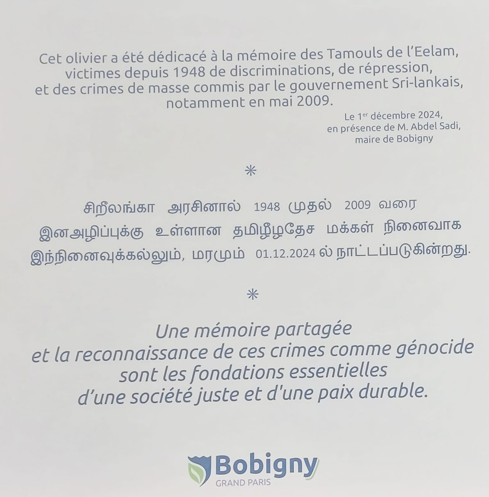 பிரான்சு தேசத்தில் பாரிசின் புறநகரில் ஒன்றான Bobigny நகரில் தமிழீழ தாயகத்தில் 1948 முதல் 2009 வரை இன அழிப்புக்குள்ளான மக்களின் நினைவாக நினைவுக்கல் இன்று 07.12.2024 சனிக்கிழமை காலை 10.00 மணிக்கு திரை நீக்கம் செய்யப்பட்டு வைக்கப்பட்டது.