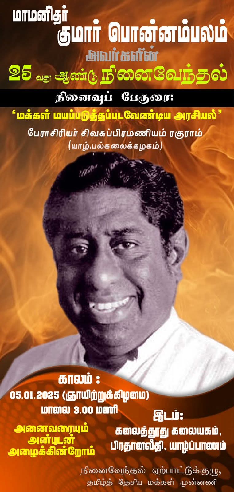 மாமனிதர் குமார் பொன்னம்பலம் அவர்களது 25 ஆம் ஆண்டு நினைவுப் பேருரை நிகழ்வு தமிழ்த் தேசிய மக்கள் முன்னணியின் ஏற்பாட்டில் யாழ்ப்பாணத்தில் நடைபெறவுள்ளது.