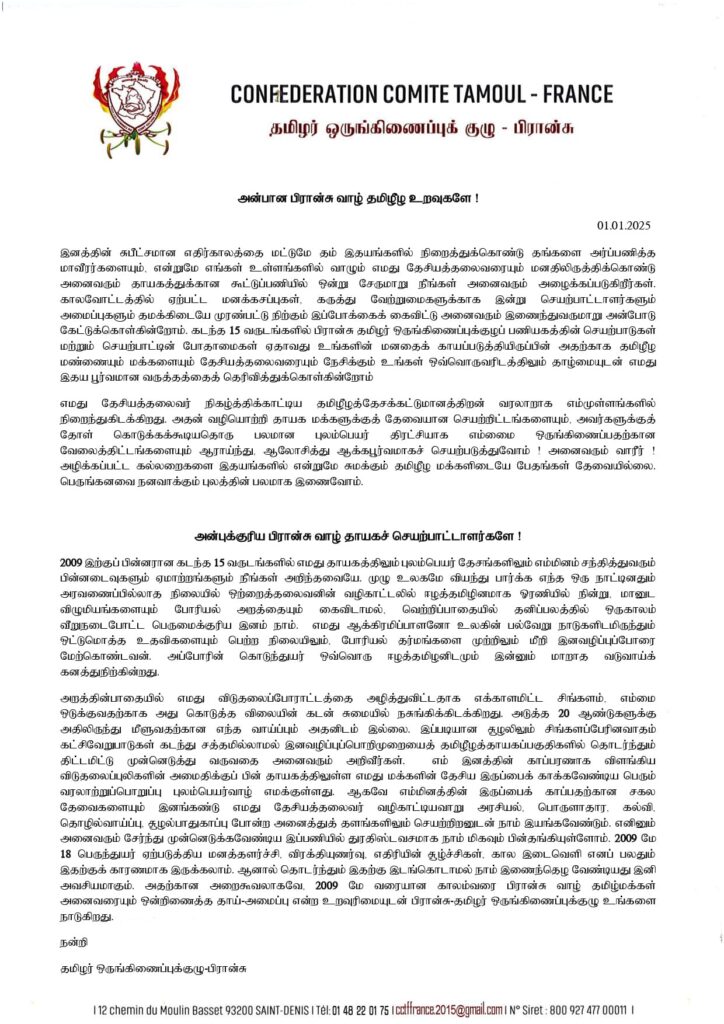 அன்புக்குரிய பிரான்சு வாழ் தாயகச் செயற்பாட்டாளர்களே!